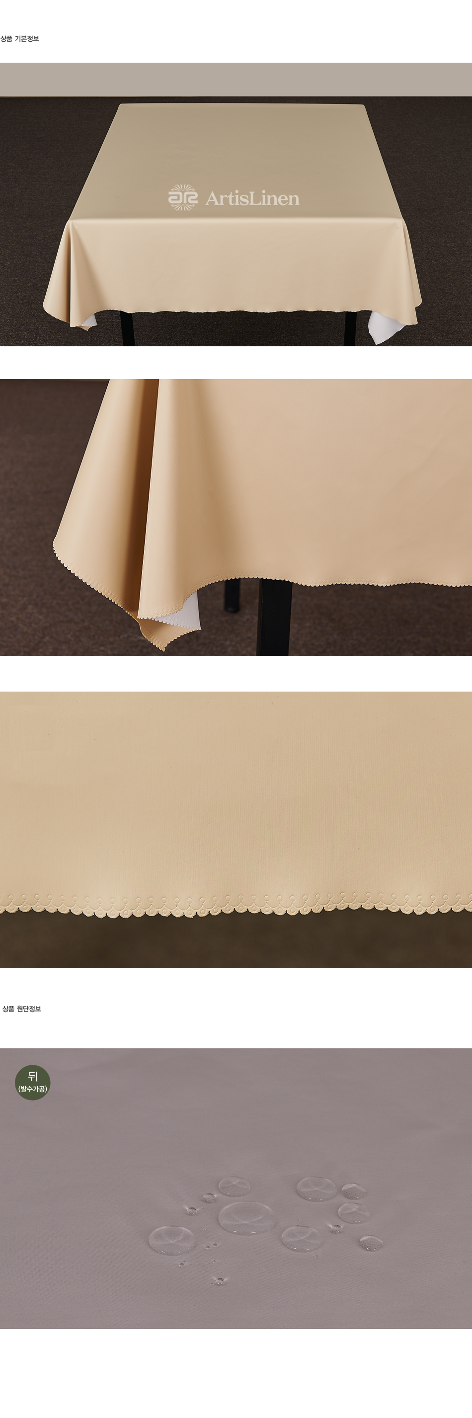 뒷면은 발수코팅 처리하여 물이 스며들지 않고 굴러 떨어지므로 오염이 되지 않습니다.